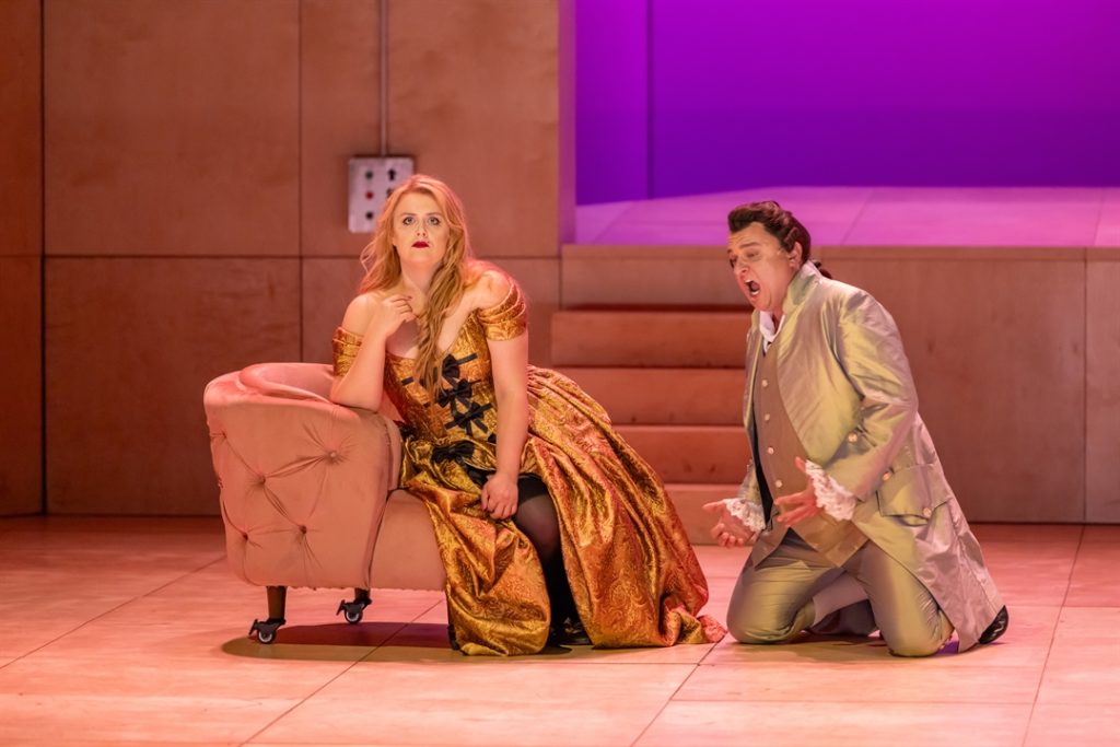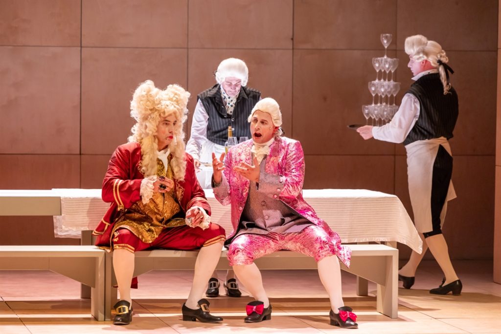 Z pewnością ciekawym i mocno przez niektórych wyczekiwanym doświadczeniem były klasyczne kostiumy, zgodne (może nie w stu procentach wiernie, ale jednak…) z epoką i duchem samej opery, czyli w tym przypadku wiekiem osiemnastym. Wielka w tym zasługa autorki tychże kostiumów, czyli Donny Raphael, brytyjskiej artystki, która swoją karierę zaczynała jako stylistka w reklamach i teledyskach muzycznych, by potem podbić tak znane teatry jak londyński Covent Garden czy Metropolitan Opera w Nowym Jorku. Imponujące były zarówno rozłożyste suknie pań (a trzeba przyznać, że ubranie tak elegancko i tak dobrze również całego chóru to wielka sprawa), jak i skrzące się przepychem fraki panów, które w połączeniu ze spodniami typu culotte dawały fantastyczny efekt. Może stąd, aby oddać pola bogatym strojom, dekoracje sceny (Blanca Añón) były dość surowe, proste. Chociaż niezwykle urocza była różowiutka sofka w domu Geronte, a miniaturowy teatrzyk, w którym kukiełki wspinały się po wielkich makietach kobiecych piersi, do złudzenia przypominał słynną scenę z „Kingsajzu” Juliusza Machulskiego. Oddały one jednak naturę Manon, która kusi, może trochę wbrew sobie, przyciąga mężczyzn, a ci momentalnie tracą dla niej głowę. Duży wkład w kreowanie atmosfery na scenie miała reżyseria świateł, za którą odpowiadał Marc Gonzalo, choć momentami to światło było nieco zbyt krzykliwe, przez co mogło razić osoby o wrażliwszych oczach.